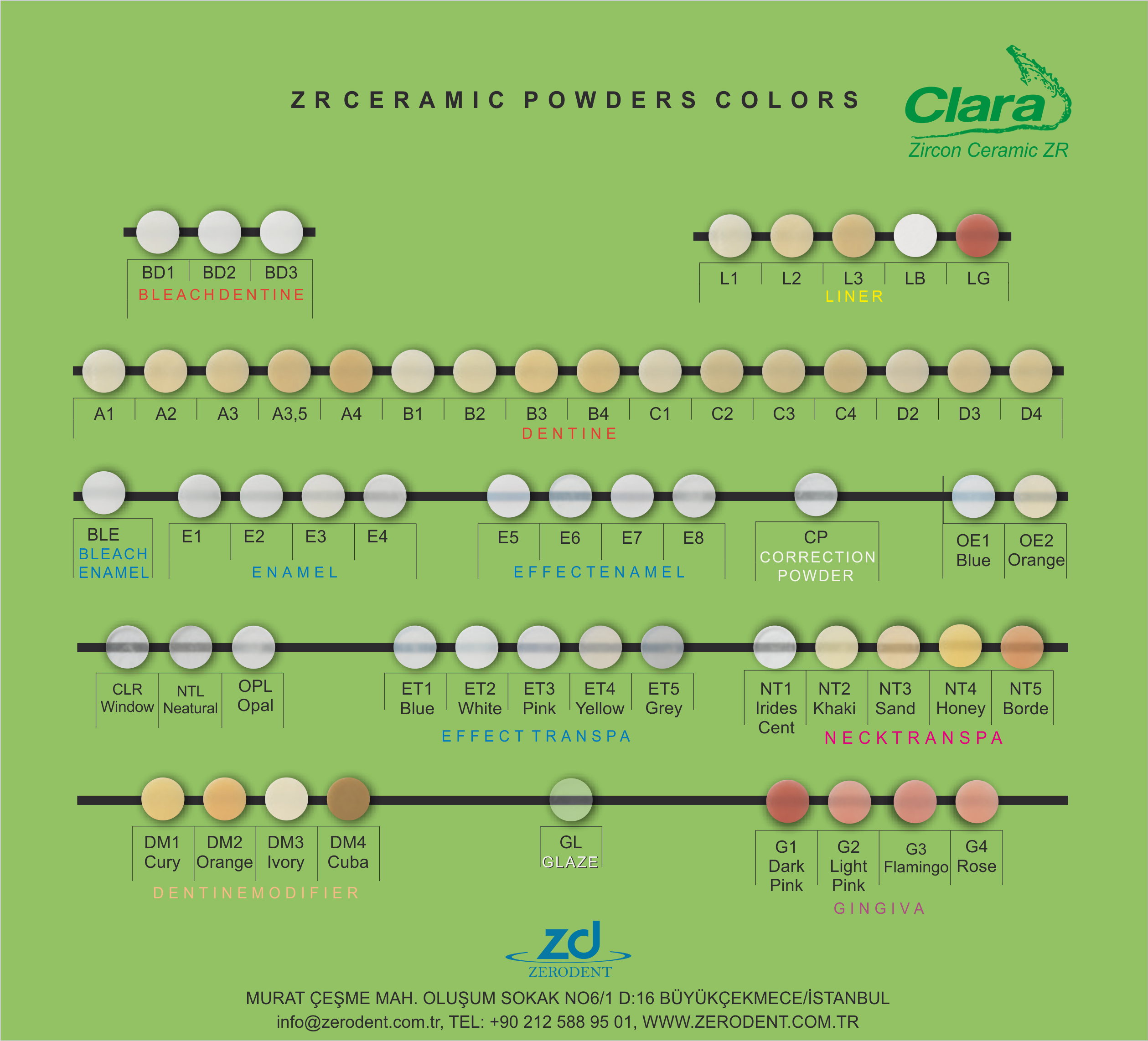 Estetik ve sağlamlık ön plana alınarak Avrupa’da üretilen Clara porselen tozu ve opakları, yeni nesil Nano Grenleme Teknolojisi ile